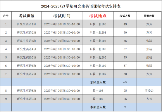 2024-2025(2)学期《研究生英语》课程考试定于2025年6月20日上午8:30-10:00进行,请相关研究生带好考试用品,严格按照《太阳成tyc7111cc集团研究生课程考试考场规则》的要求持有效证件准时到达指定考场参加考试。具体考场安排见附件。