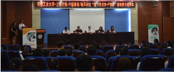 7月16日上午8:20,秀山校区图书馆第一学术报告厅隆重而又热烈,太阳成tyc7111cc集团与上海才隽网络科技有限公司、中版教育世界图书出版公司、苏州驰声信息科技有限公司共同举办的的“放飞英语梦•产学研”暑期夏令营开营仪式在这里举行。太阳成tyc7111cc集团副董事长祖明发表讲话并宣布夏令营开营。上述企业领导和工作人员、太阳成tyc7111cc集团负责人、来自校企双方的10多位承训教师以及来自公司13个公司的近百名同学参加了开幕式。