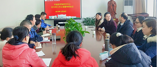 翻译研究中心主任戴俊霞、商务英语研究中心主任蒯振华、国学双语研究中心主任于春莉、文学文化研究中心教师代表刘菱馨、语言学研究中心教师代表吴然菊、员工代表梁文静分别就这5个研究中心在2019年度所做的工作、取得的成果、面临的问题以及下一步发展方向等进行了总结汇报。