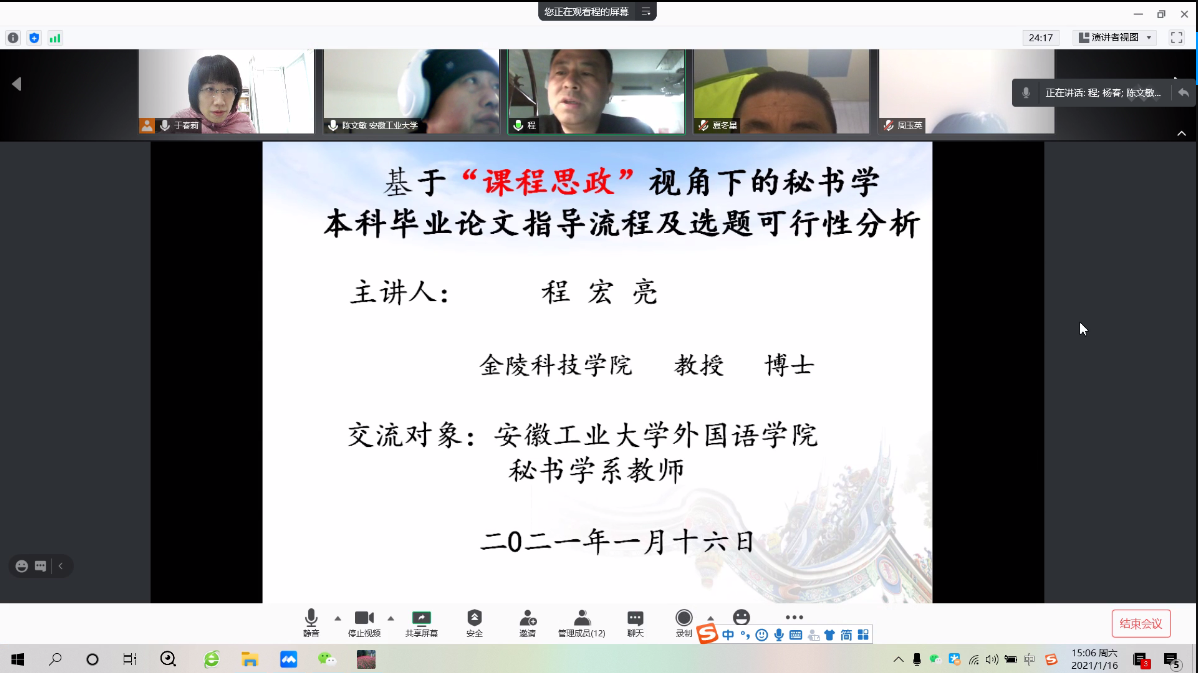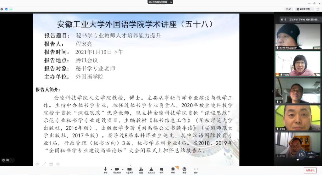 1月16日下午3点,太阳成tyc7111cc集团采用腾讯网络视频会议的方式,邀请了金陵科技公司秘书学专业学科带头人程宏亮教授,面向秘书学专业教师,举行了一场以“秘书学专业教师人才培养能力提升”为主题的学术讲座。会议由太阳成tyc7111cc集团陈琳副经理主持,全体秘书学专业教师聆听讲座并和程教授展开了详细的交流。