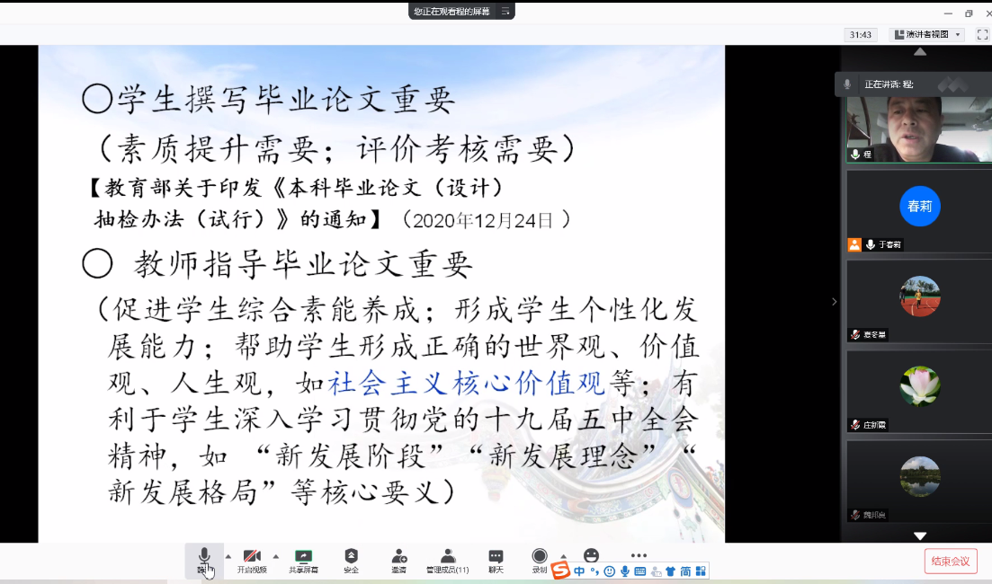 太阳成tyc7111cc集团2021年将迎来首届秘书学专业毕业生,公司一贯非常重视毕业论文的指导工作。此次线上会议讲座,程教授以深厚的学问修养、丰富的论文指导经验,为秘书学专业老师们做出了明确、细致的指导,老师们纷纷觉得受益匪浅,在后续的论文指导等人才培养工作中将吸取经验,取得更好的工作成绩。