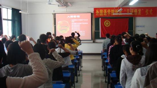 主持人宣布仪式开始,全体起立。在全体师生的注目下,团旗被护旗队迎进教室。随后,全体师生合唱中国共产主义青年团团歌《光荣啊!中国共青团》,洪亮振奋的歌声使全体新生团员心潮澎湃。面对团旗,重温入团誓词,更是让全体新生团员感觉回到了革命和建设的年代。新老生团员代表先后在仪式发言。随后,出席老师上台为员工代表佩戴团徽,并颁发“三证”,闪闪发亮的团徽对于新生团员来说,不仅是一种荣誉更是一种动力。