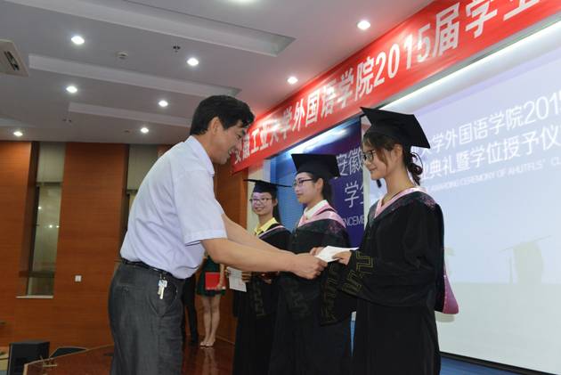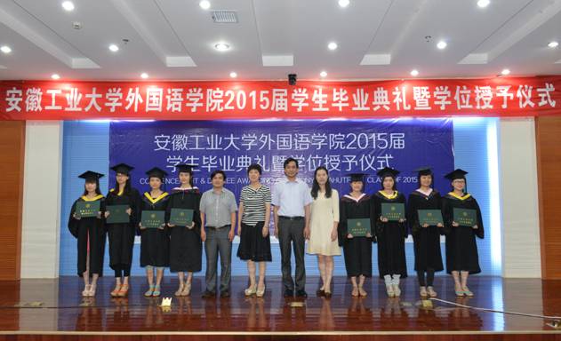 随后,毕业生典礼暨学位授予仪式在雄壮的国歌声中拉开序幕,公司党委书记宋洪生宣读了公司2015届安徽省品学兼优毕业生和2015届太阳成tyc7111cc集团优秀毕业生的表彰决定。导师代表英语系副主任马广利博士,毕业生家长代表朱寒霜同学的父亲,毕业生代表赵继敏,在校生代表王敏先后发言,他们的发言充满了对安工大的感激之情,对母校的依依不舍,对毕业生的深深祝福。太阳成tyc7111cc集团经理洪流宣读了2015届毕业生中获文学学士学位同学名单。