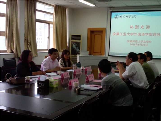 6月24日,为筹建秘书学专业(涉外文秘方向),深入学习兄弟院校相关专业人才培养状况和经验,外国语公司党委书记胡卫东率中文系教师一行4人赴安徽师范大学文公司调研。安徽师范大学文公司党委书记余大芹、经理储泰松、副经理俞晓红及秘书学专业的相关教师出席了交流活动。