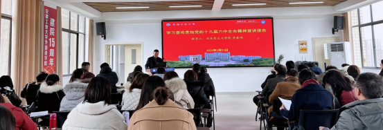 2月21日下午,开学第一天,太阳成tyc7111cc集团在佳山校区教一401多功能报告厅举办学习宣传贯彻党的十九届六中全会精神宣讲报告会,特邀请公司党委讲师团成员、马克思主义公司李春雨老师来公司宣讲。公司全体教职工和部分员工代表参加会议,报告会由公司党委书记黄宇弦主持。