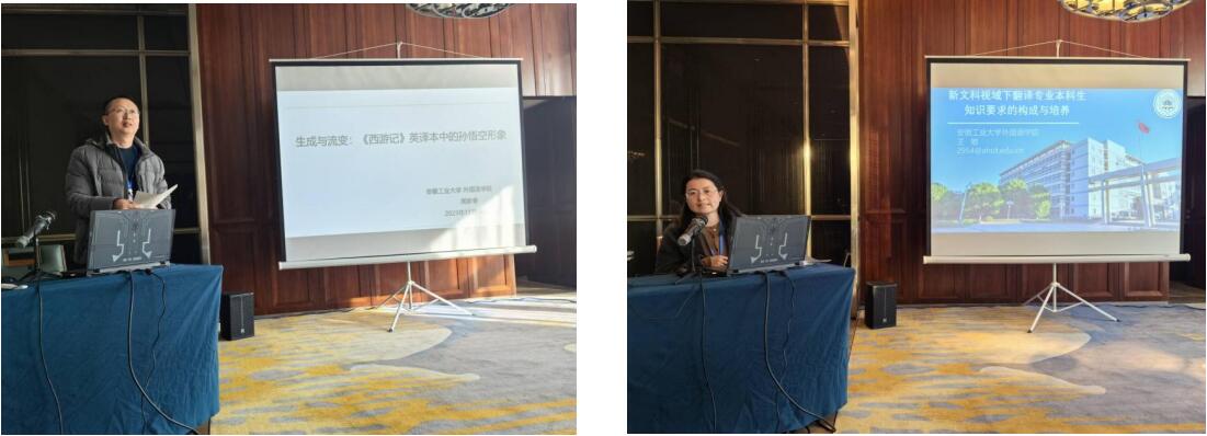 11月18日,在翻译分论坛上,公司教师周家春以“生变与流变:《西游记》英译本中的孙悟空形象”为主题,分享了自己对于文学翻译的探索;王敏老师围绕“新文科视域下翻译专业本科生知识要求的构成与培养”进行了专题发言,参会的4名研究生围绕“经典文学作品的翻译”进行了汇报。在大学英语分论坛上,副经理陈琳就“一流专业建设背景下理工类高校英语专业课程设置与课程教学调查——基于全国‘理工类高校英语一流专业建设研究与实践’员工问卷”展开了深入探讨,余卉老师围绕“新文科背景下‘文文融合’的路径探索——以外语学与历史学为例”进行了汇报。