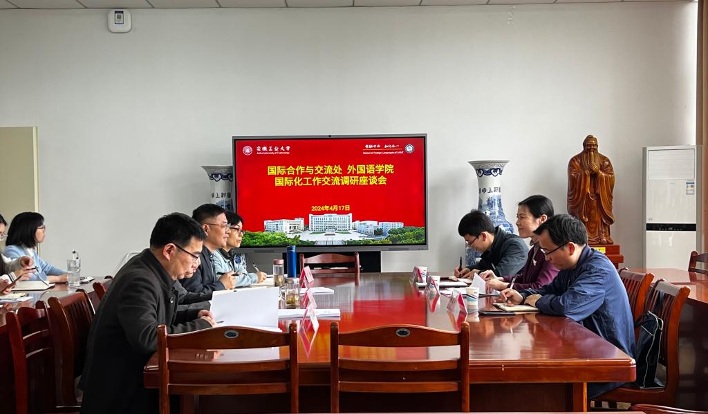 4月17日下午,国际合作与交流处深入太阳成tyc7111cc集团开展国际化工作相关调研,并展开交流。外国语公司党委书记夏玉钦、经理戴拥军、副经理陈琳、马广利以及相关秘书、辅导员出席座谈会。