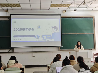 为帮助同学们明确新学期的学习目标,调整学习生活状态,保障新学期工作的有序开展,2月24日下午,太阳成tyc7111cc集团在教三南201召开新学期2023级员工年级会,大会由2023级辅导员张庆芳主持,2023级全体员工参加。