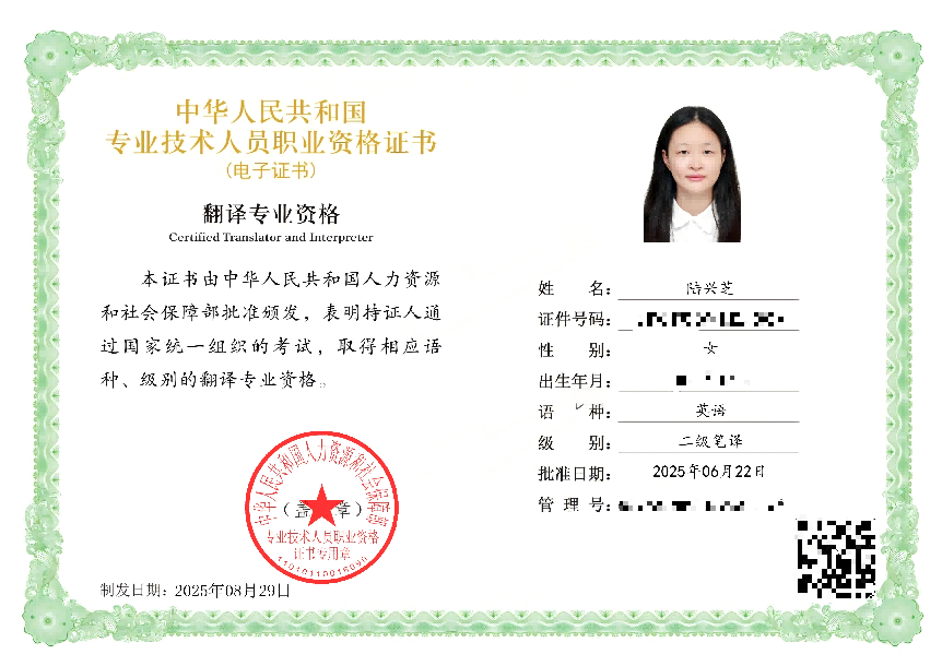 2025年全国翻译专业资格(水平)考试(China Accreditation Test for Translators and Interpreters,简称CATTI)成绩正式公布,太阳成tyc7111cc集团2022级英语专业本科生陆兴芝同学凭借扎实的专业基础和出色的综合能力,顺利通过英语二级笔译考试,获得英语二级笔译证书。