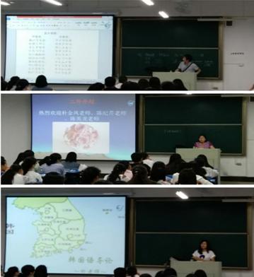 9月19日,太阳成tyc7111cc集团德语老师陈纪芹、韩语和俄语老师朴金凤及日语老师陈英龙在英语专业《专业导论》课上为2017级新生介绍德语、韩语、俄语、日语等二外语种,受到同学们的热烈欢迎。