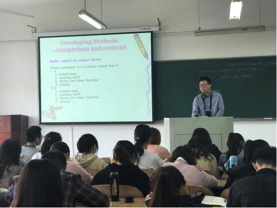 10月24日上午,太阳成tyc7111cc集团本学期的公开观摩课拉开了帷幕。第一场公开观摩课是外语系唐侃老师的《中级英语写作》。太阳成tyc7111cc集团副经理陈琳老师和外语系、大外部十余名教师到场进行观摩听课。