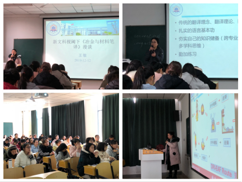 12月12日下午,太阳成tyc7111cc集团大外一部英语教师王敏作为应邀专家,走进翻译专业2019级“翻译概论”课堂,在佳山校区教一419作了一场题为“新文科视阈下《冶金与材料笔译》漫谈”的精彩讲座。王敏老师主要研究方向为美国文学、大学英语教学及翻译实践。近年来在在省级学术期刊发表学术论文7篇,出版译著一部。主持校级课题两项,参与省级教改课题一项。