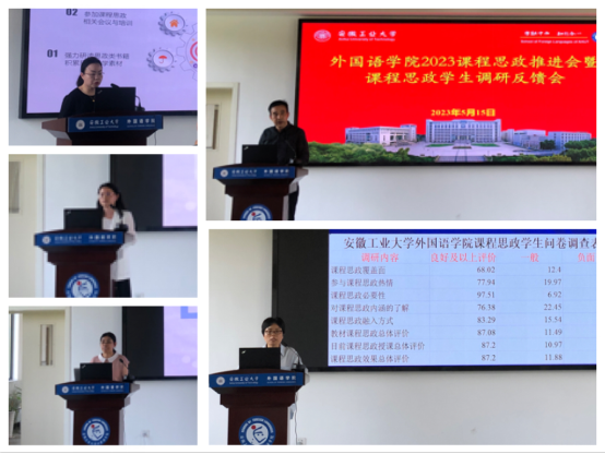 会议由四项议题组成,分别是:1.二外法语课程思政建设情况汇报,汇报教师为外语系法语教师吉玉婷;2.课程思政视域下大学英语“智慧课堂”建设:理念与实践,汇报教师为大外一部王敏;3.了解世界文化,讲好中国故事——《大学提高英语》课程思政实践,汇报教师为大外一部贾冬梅;4.外语系课程思政员工调研反馈,汇报教师为副经理陈琳。