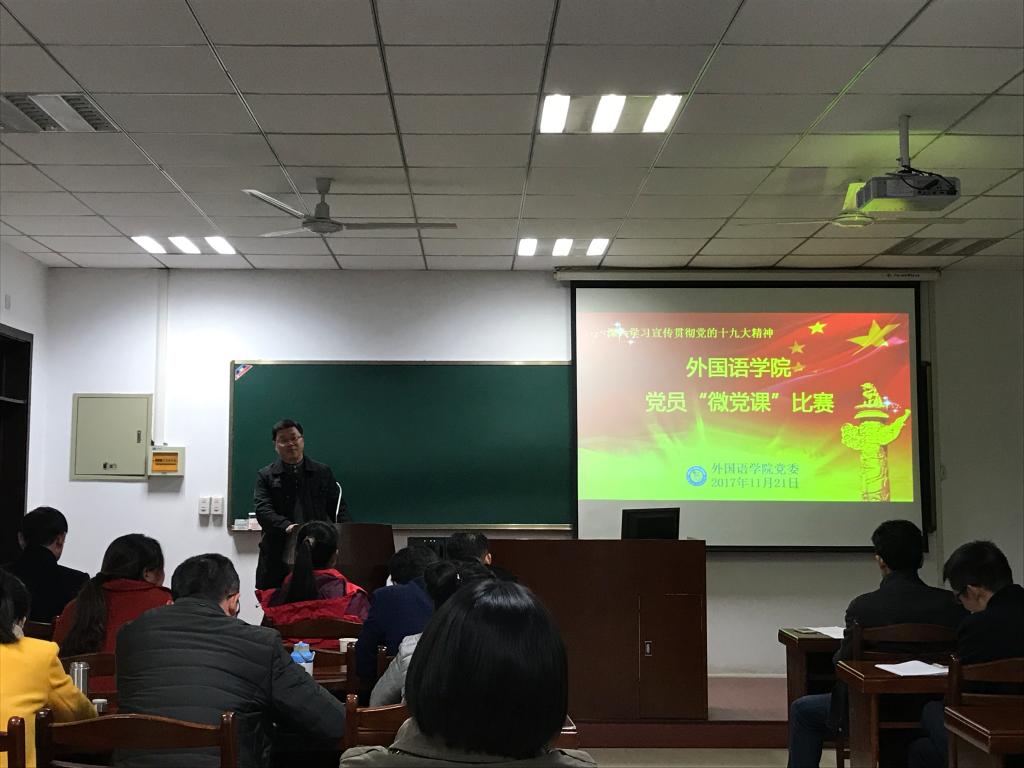 为深入学习宣传贯彻党的十九大精神,丰富党员政治理论学习形式,促进理论学习效果与教学能力的双提升,实现以赛促学,11月21日下午,外国语公司党委在秀山校区汇文楼C503开展了党员“微党课”竞赛观摩活动,公司6个党支部选拔的8位选手参加了比赛。校纪委副书记、纪委办主任、监察处处长王俊和院领导洪流、黄宇弦、曹瑞斓应邀担任评委,全体师生党员、系主任和各民主党派教师观摩了此次活动。公司党委书记胡卫东参与了“微党课”展示,洪流主持了比赛。