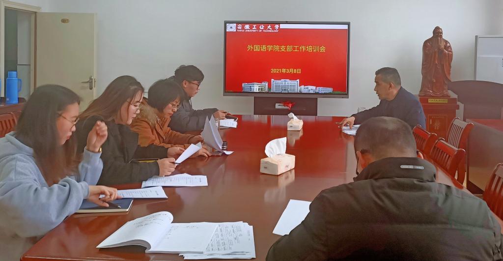 3月8日下午,外国语公司党委在佳山校区教一407室召开了支部工作专题培训会,公司党委书记黄宇弦主讲,公司两个员工党支部支委、辅导员和党委秘书参加了会议。