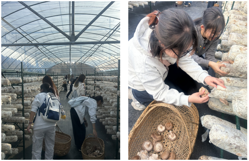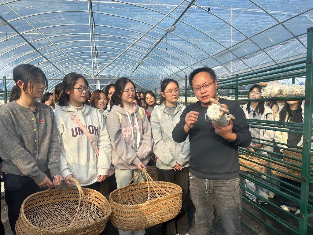 在香菇种植大棚内,驻村书记黄宁辉为党员和员工们系统讲解了从培育、采摘、分选到销售的全程技术要点,生动阐释了兴圩村发展特色产业、赋能乡村振兴的实践路径。经过现场培训,大家迅速掌握了香菇采摘的技巧。菌棚内,同学们分工协作,有的细心寻找、轻巧采摘,有的则将满载的菌筐接力传递,及时运送至烘烤室。整个流程秩序井然,大家在躬身劳作中体会农事艰辛,在默契配合里感受振兴脉动,既体验到收获的喜悦,也展现出昂扬向上、务实肯干的精神风貌。