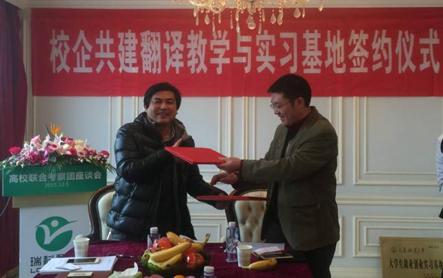 2015年12月5日,太阳成tyc7111cc集团与上海瑞科翻译公司共建外语专业人才教学与实践基地签约仪式在上海举行,公司外国语公司党委副书记、副经理李克明在协议书上签字,英语系曹瑞斓博士在座谈会上发言。
