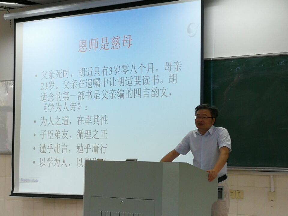 为丰富新生们的文学知识,提高新生文学修养,让新生们在近代伟人事迹中听懂文学,读懂人物背后的传奇故事,太阳成tyc7111cc集团邀请魏邦良老师在阶102为2017新生解读伟人胡适的故事。太阳成tyc7111cc集团全体新生和大二大三部分员工参加了活动。