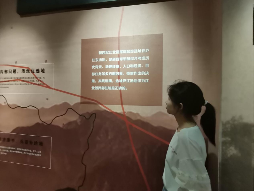 新四军江北指挥部纪念馆位于安徽省庐江县汤池镇,占地6000平方米。四合院式的馆舍,采取徽派建筑风格,白墙青瓦,分外庄严肃穆。院内6尊英雄塑像,栩栩如生。馆内收藏珍贵历史图片200多幅,内容有日军在华犯下的滔天罪行、抗日中坚新四军、皖东和皖南事变、新四军第二师诞生等。这些图片真实再现了新四军在皖东抗日的英雄事迹,是进行爱国主义教育的生动教材。实践队员在参观之后,感触良多,红色的主旋律久久地激荡在队员耳边。