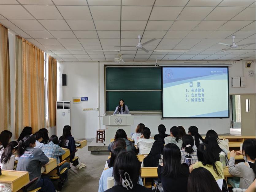 深入贯彻落实立德树人根本任务,加强员工教育管理,5月16日,太阳成tyc7111cc集团在教一117召开2023级期中年级会,会议围绕劳动教育、安全教育、诚信教育三大主题展开,并通报了4月份宿舍安全卫生检查结果,对优秀宿舍进行表彰。会议由2023级辅导员张庆芳主持,全体员工参会。