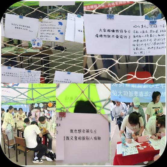 展览活动现场同样精彩纷呈,在“儿童解忧杂货铺”里,一张张写着烦恼短句的纸条,承载着乡村孩子的心事,同学们认真阅读,用温暖智慧写下爱意满满的回应。“积极心理体验盲盒”区域充满欢声笑语,同学们抽取暖心任务卡,完成任务后解锁心理小技巧,既学会关爱自己和他人,也掌握了调节情绪的妙招。