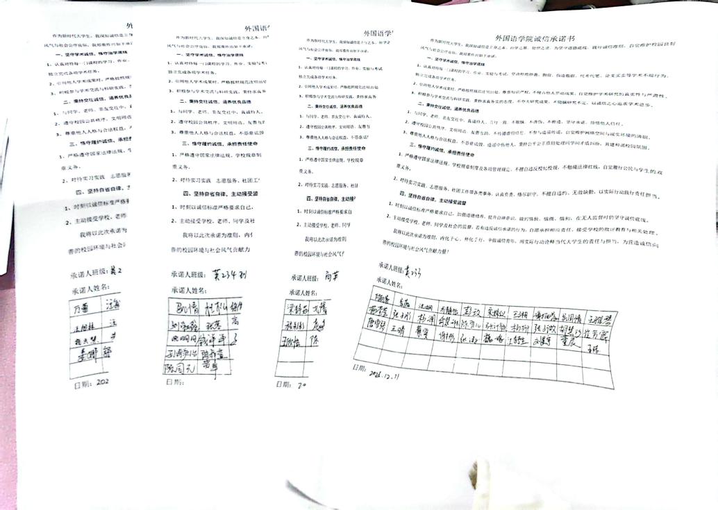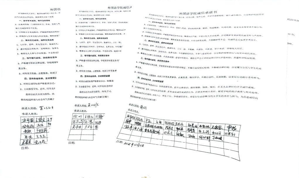 此外,会议还组织员工签署《诚信承诺书》,观看诚信主题短视频,通过沉浸式教育强化责任意识。辅导员们寄语全体员工,希望大家将诚信融入语言学习、文化传播的全过程,以诚信品格赋能专业成长,争做“言行一致、文韵相承”的外语人才。